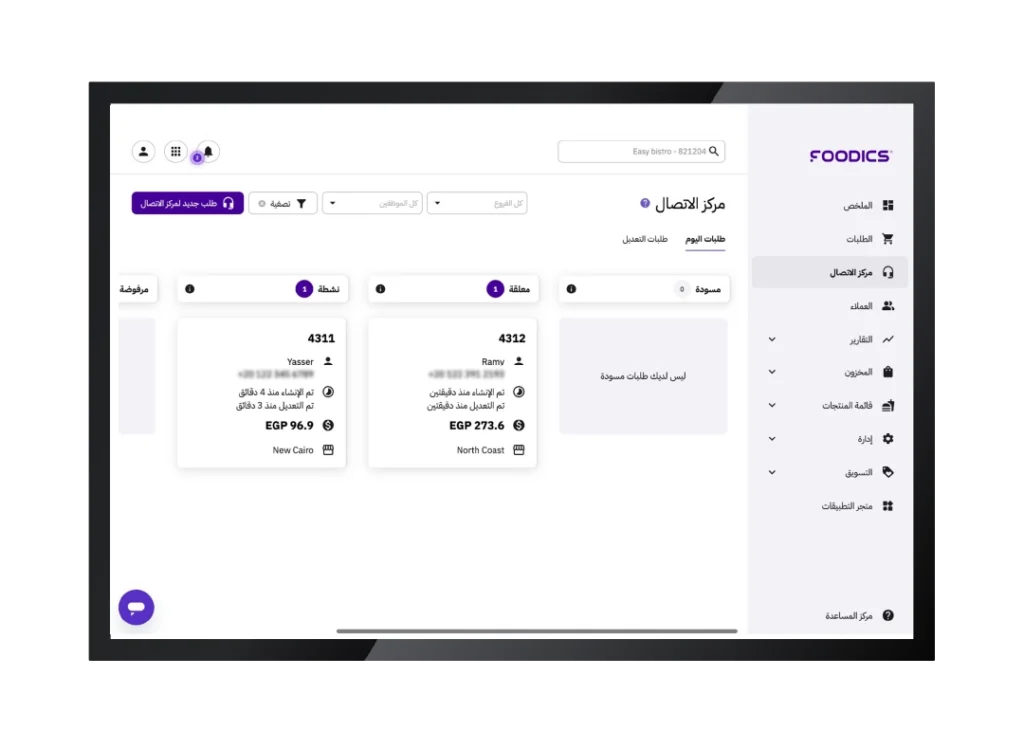 - تقليل الأخطاء اليدوية بفضل الربط المباشر بين مركز الاتصال ونظام نقاط البيع والمطبخ.
