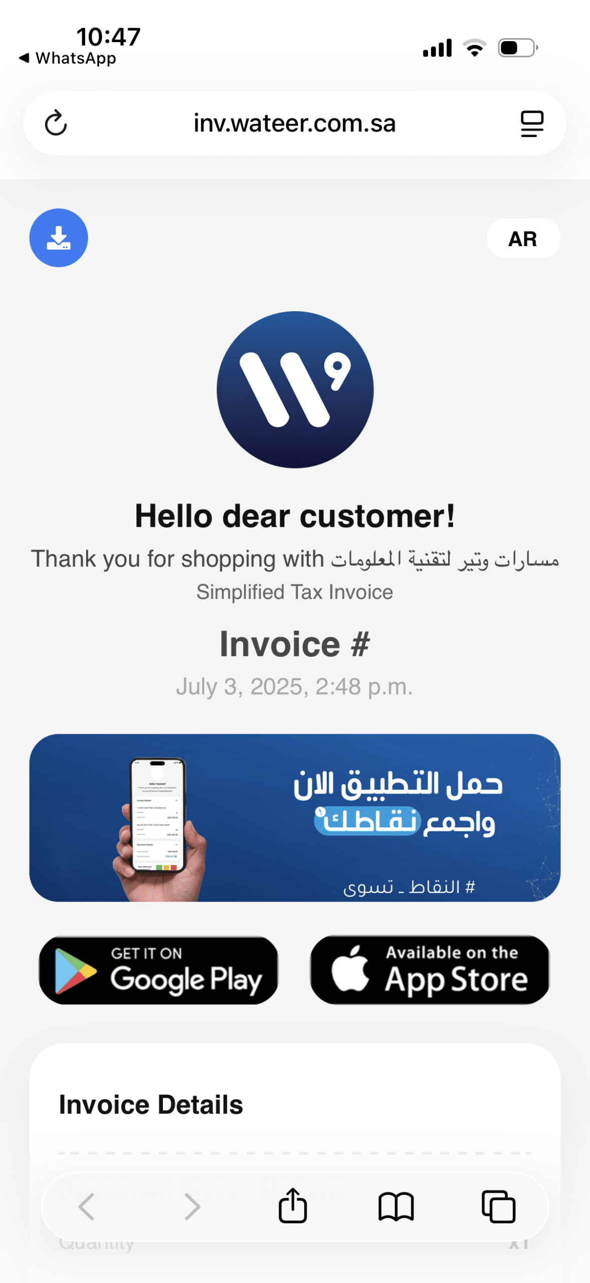 - إضافة مساحات تسويقية، عروض، أكواد خصم، أو تحميل التطبيق داخل الفاتورة