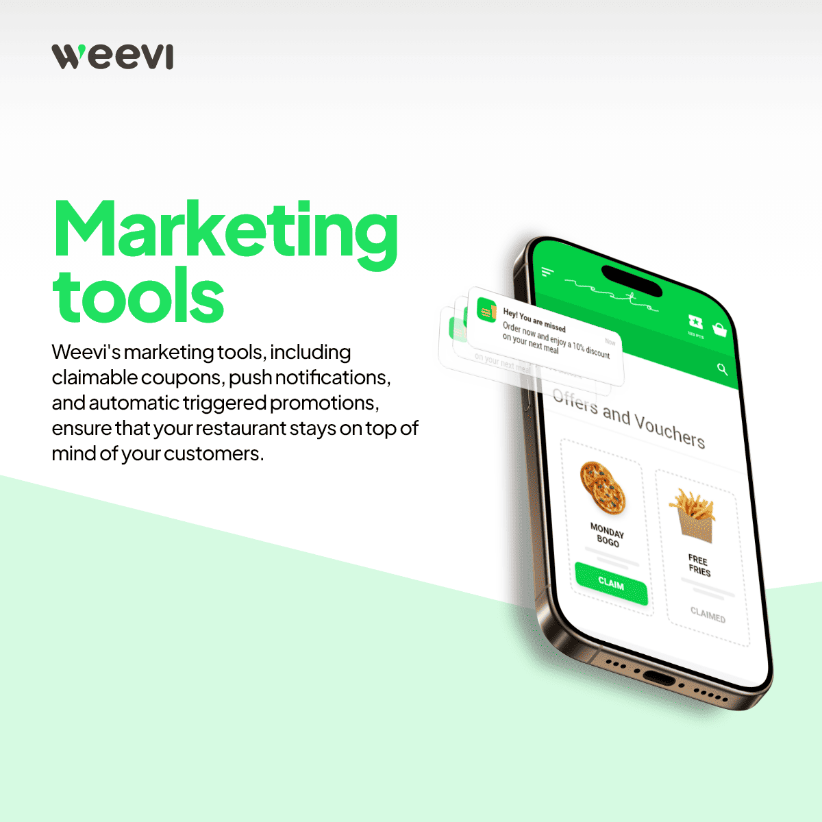 Beyond ordering, Weevi includes built-in marketing, upselling, and loyalty tools to increase basket size, retain customers, and turn them into brand advocates. Whether managing one branch or fifty, Weevi scales effortlessly and syncs all online orders directly to your Foodics POS.